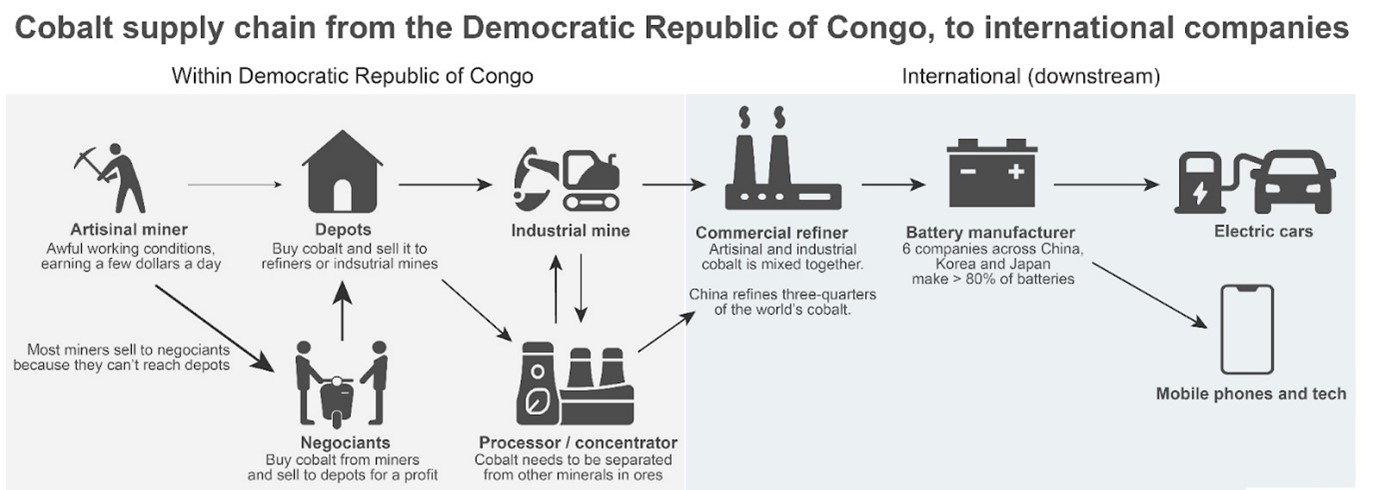 Whilst multinational corporations seek to identify and mitigate human rights risks through sourcing from industrial mines to ensure greater transparency on the source of minerals. The challenge for companies is that artisanal and small-scale mining (ASM) enter the supply chain due to the lack of oversight and registration. This means minerals are easily smuggled across the border or, enter via depots resulting in companies being complicit without their knowledge. To illustrate: